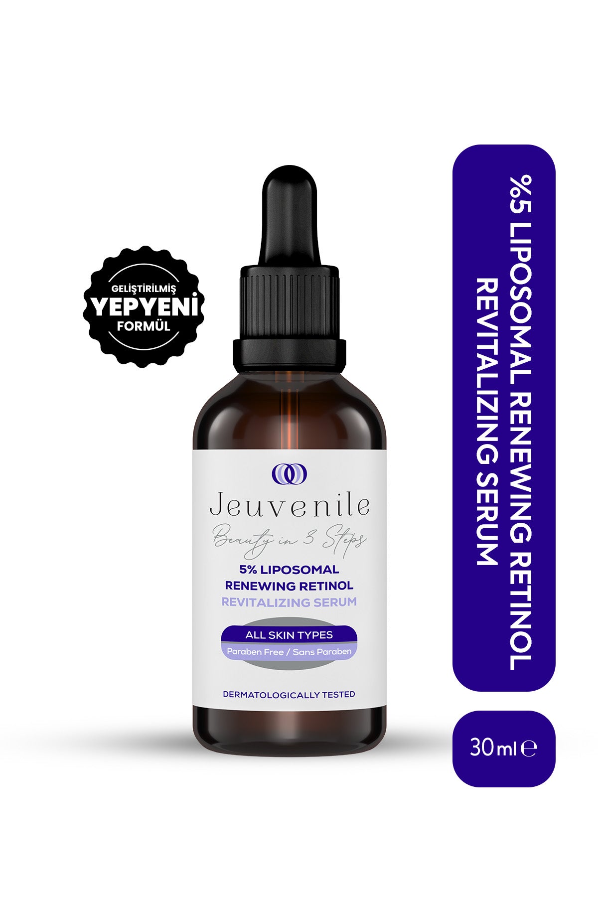 Jeuvenile %5 Liposomal Renewing Retinol Serum, yaşlanma karşıtı bakımda yüksek etkinlik arayanlar için özel olarak geliştirilmiş bir serumdur. İçeriğindeki %5 retinol ile kırışıklık görünümünü azaltmaya, cilt dokusunu yenilenmeye ve cilde daha genç bir görünüm kazandırmaya yardımcı olur. Liposomal taşıyıcı sistemi sayesinde retinolün etkinliği artırılırken, ciltte daha konforlu bir kullanım sunar. Ürün ayrıca tüm cilt tipleri için uygundur.
